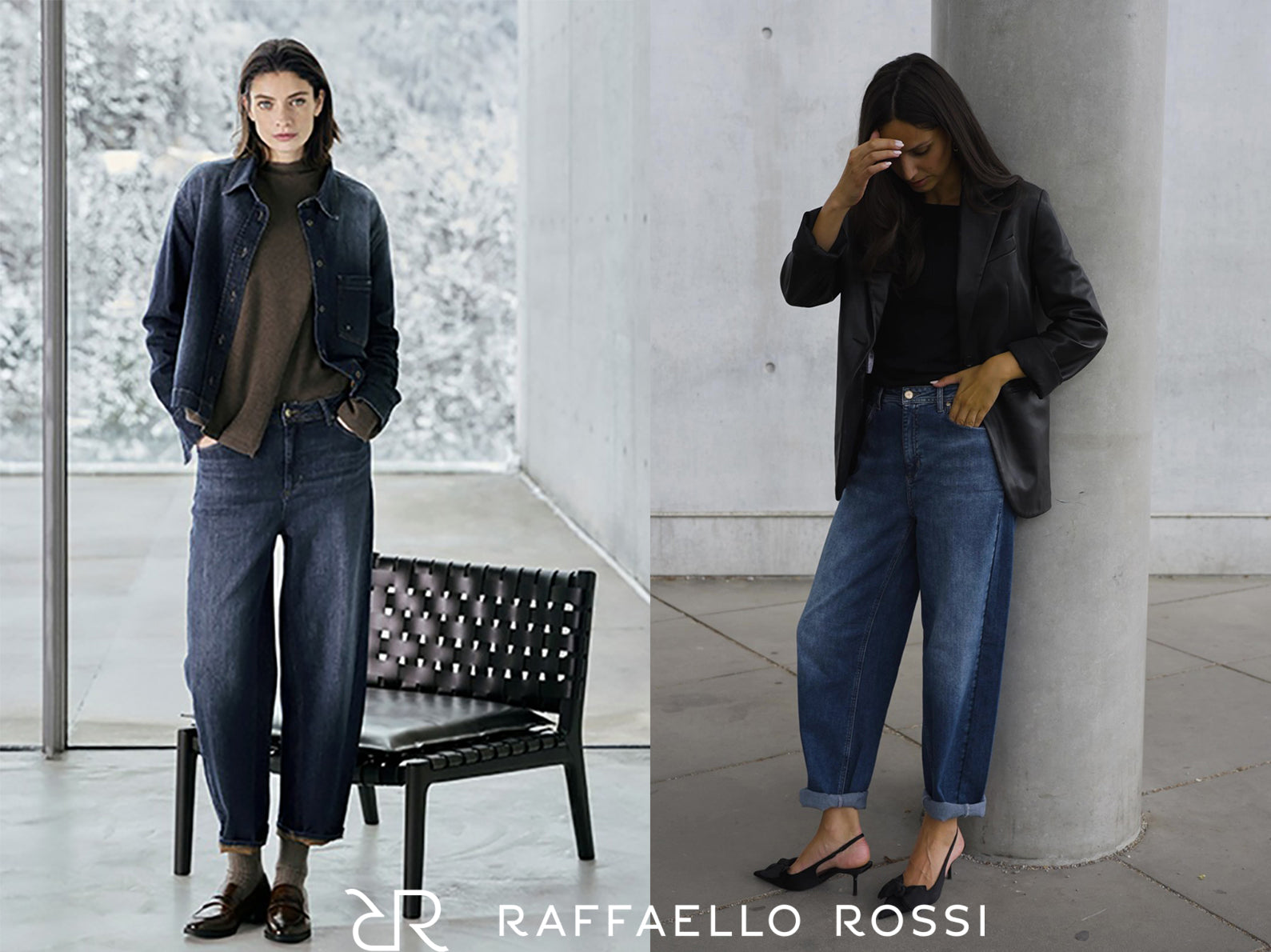 Malloni MLO jean with bowed barrel leg and knee darts. Features vertical seam detail on front with large round pockets and vertical seam detail above large patch pockets on rear....