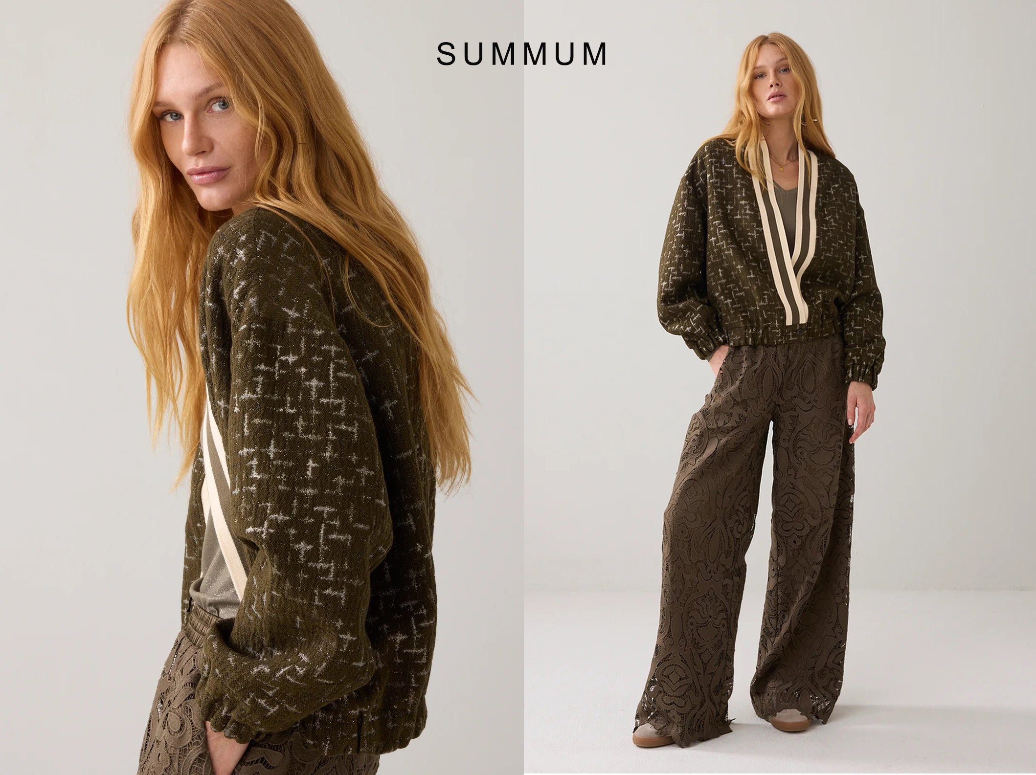 Malloni MLO trouser in soft, subtle chevron velour with a gorgeous cream, taupe and olive colour wash. Features wide legs with seam detail, classic pockets on front and patch pockets...