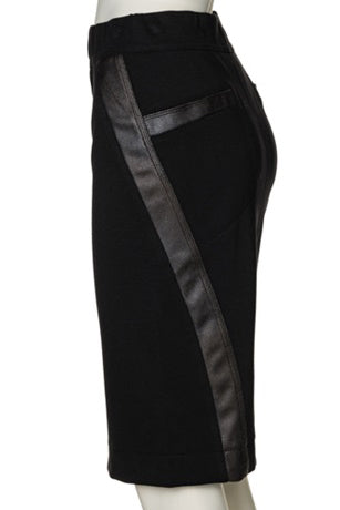 Beate Heymann double layered, stretch jersey, knee length pencil skirt. Fitted silhouette with a flat front waistband. Features double stitch down front, mock rear pockets with pleather trim and pleather trim sloping from side to back. Shallow back slit
