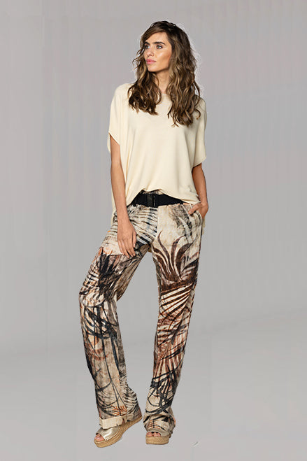 Beate Heymann linen and cotton mix straight leg trouser with a washed palm print. Features mock pocket trim on rear, square pockets on front and turn ups. Zip and popper closure with an elasticated snap belt.