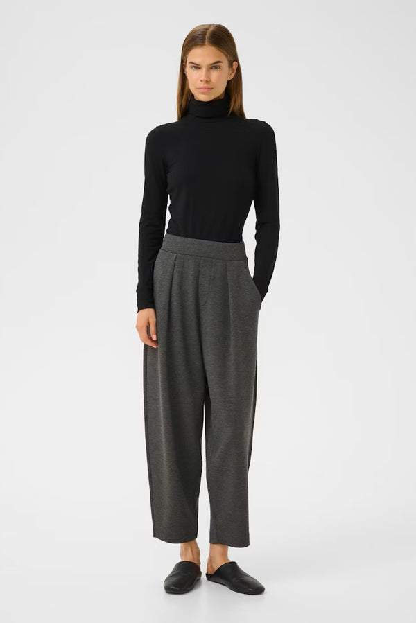 InWear trouser in soft tencel with comfort elastic waistband. Features a barrel leg, welt pockets on back and front vent pockets. Pleats and a barrel leg elevates this casual trouser.