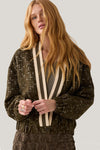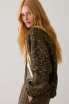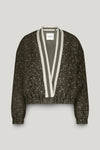 Summum open V, light jacket in lurex jacquard with elasticated hem and cuffs. Features a rib stripe trim and single button closure at waist. Fully Lined.