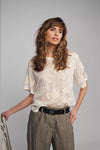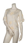 Beate Heymann organza short sleeve top with floral embroidery. Features a Hi Lo hem with side slits and tapered sides at front. Stretchy textured trim on neck, sleeve and hem.