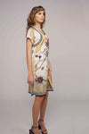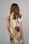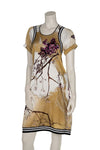 Beate Heymann satin feel, floral and twig print dress. Features a round neck and short cuffed sleeve with jersey rib, stripe trim around armhole and hem.