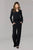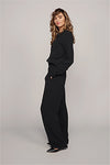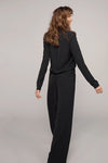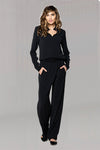 Beate Heymann jersey crepe straight leg trouser with a slight wrap front. Features a side zip, vent pockets on front with trim and mock pocket on rear with trim and single button. Elasticated snap belt.