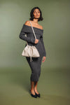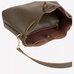Every Other small, faux leather tote bag with magnetic and drawstring closure. Features detachable, adjustable crossbody strap, detachable handle and internal, loose zip pouch.