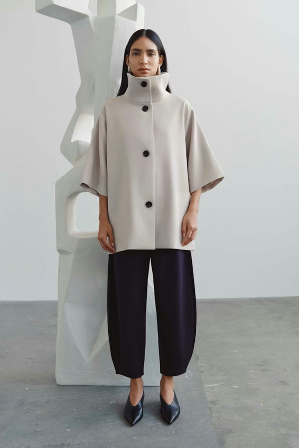 Inwear woven high funnel neck jacket with half sleeves. Features four large buttons and side pockets.