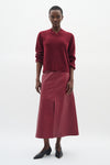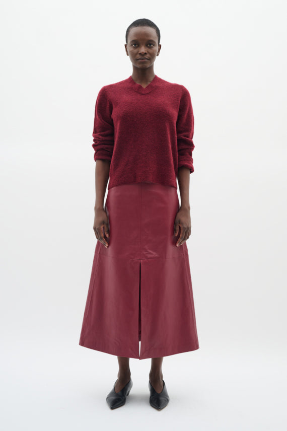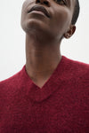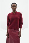 Inwear sweater with a glossy sheen. Features a rib V neck with wide rib cuffs and rib hem.