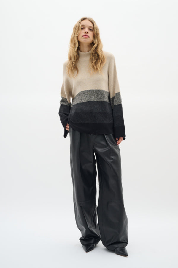 Inwear high neck sweater effortlessly chic and endlessly versatile, this fine ribbed knit sweater features a soft, lightweight texture with a cozy high neck, wide sleeves and broad contrasting stripes., it drapes beautifully while remaining refined enough to tuck neatly into trousers or skirts.