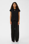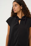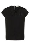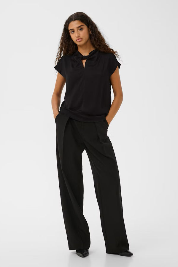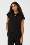 Inwear silky cap sleeve top with a keyhole twist front. Features a keyhole with small covered button at back.