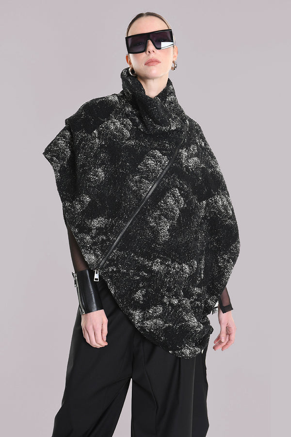 La Haine Inside Us asymetric woven cape. Open right side and longer, half open left side with a drawstring to gather. Features an open funnel neck with asymetric zip. Fully lined.