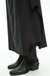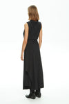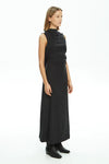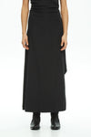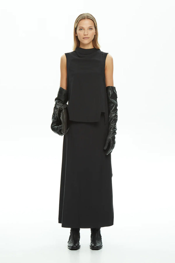 MLO contemporary A Line maxi skirt in crisp, stretchy viscose. Features a double layer with side cut out on left hem, flat front waistband and side zip.