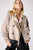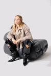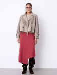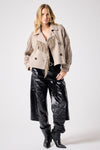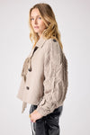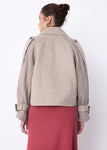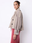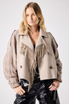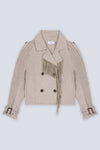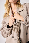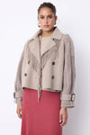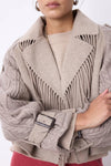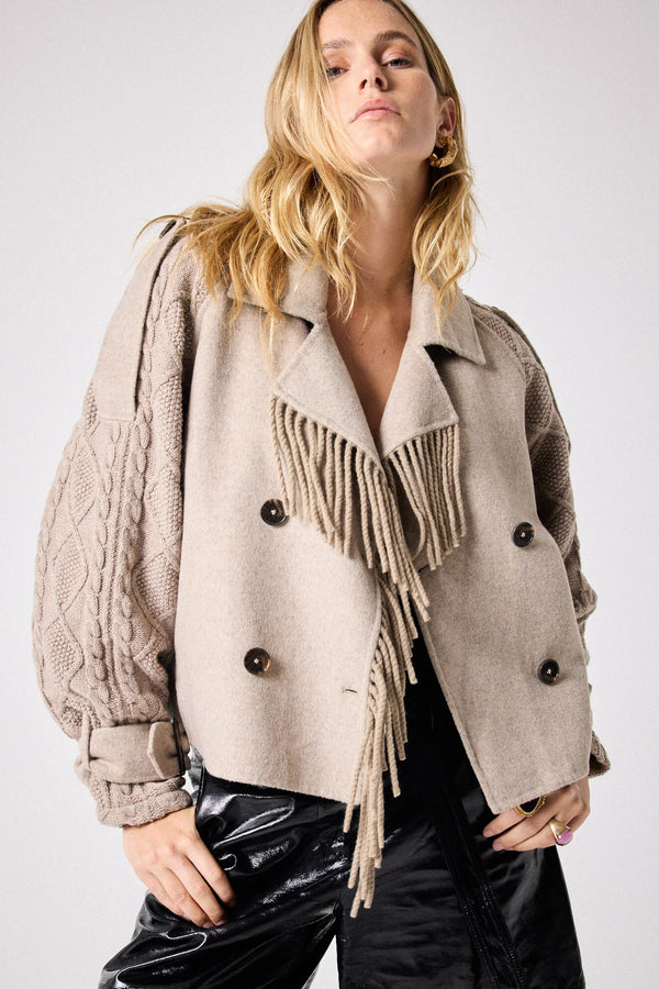NotShy wool mix double breasted crop trench jacket with fringed lapel. Features a cable knit sleeve with buckle