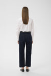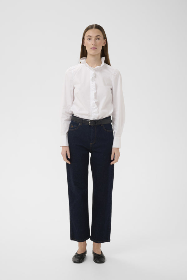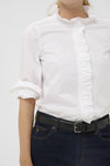 Inwear stretch, cotton shirt with ruffle covered button plaket and a ruffle edged mandarin collar. Features seam across back with subtle pleating and a darts on front.