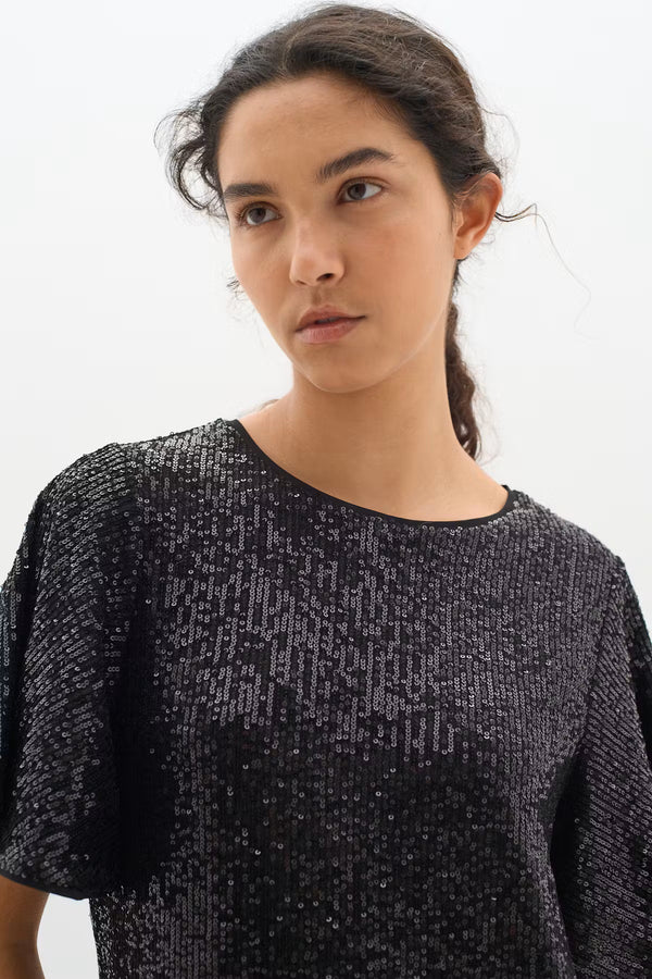 Inwear fully sequined top with a straight bodice and a full, short flared trumpet sleeve. Features keyhole and button closure at back.