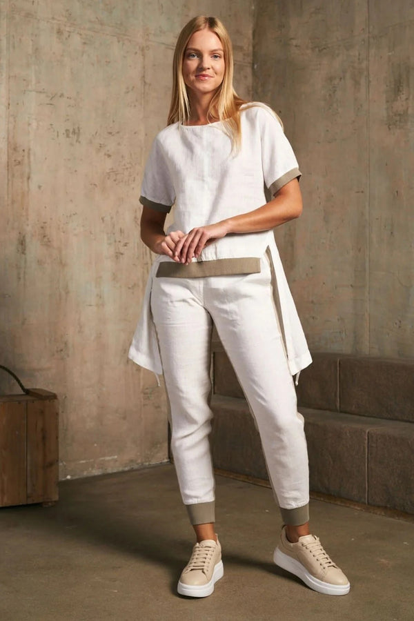 LU.EL TOP LINEN SHORT SLEEVE HI LO DRAWSTRING HEM RIB TRIM SL51816 WHITE