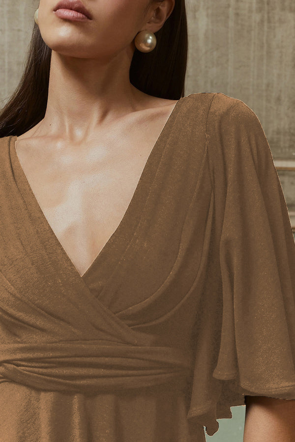 Mes Demoiselles soft lyocell and wool mix jersey top. Features pleat 'V', underbust seam, sash waist and cape sleeve.
