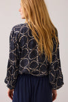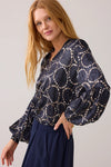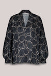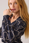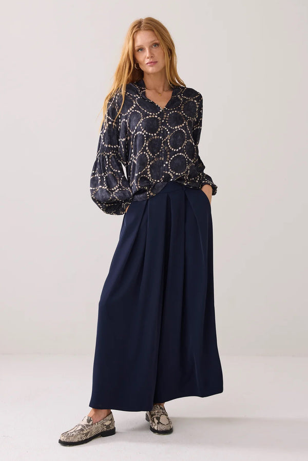 Summum silk feel top with a dotted circular print. Features a V neck and pleat sleeve from just above the elbow and a smock cuffs.